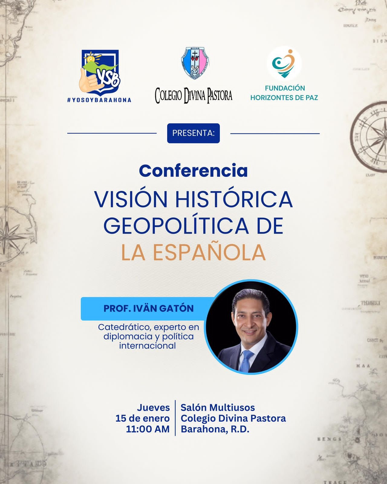 Barahona, R.D.– La Asociación Yo Soy Barahona (YSB), en coordinación con el Colegio Divina Pastora y la Fundación Horizontes de Paz, invita a la comunidad educativa, académica y al público en general a la conferencia “Visión histórica geopolítica de La Española”, a celebrarse el jueves 15 de enero, a las 11:00 de la mañana, en el Salón Multiusos del Colegio Divina Pastora, en Barahona.