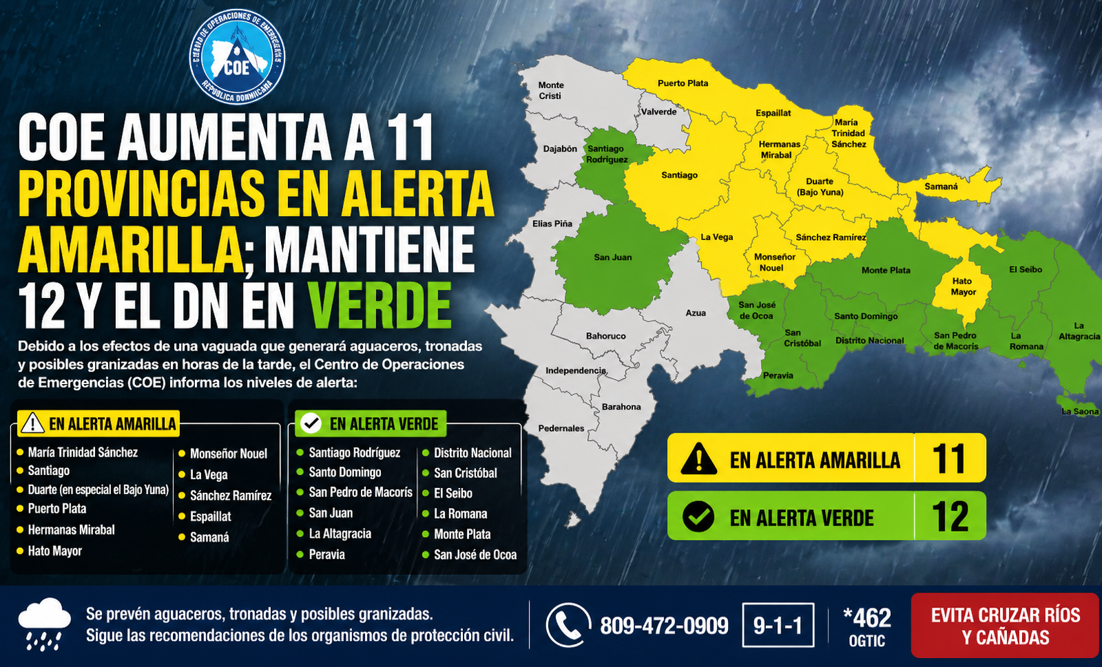 Santo Domingo.– El Centro de Operaciones de Emergencias (COE) informó este miércoles que aumentó a 11 las provincias en alerta amarilla, mientras mantiene 12 provincias y el Distrito Nacional en alerta verde, debido a la incidencia de una vaguada que continuará generando condiciones inestables en gran parte del territorio nacional.