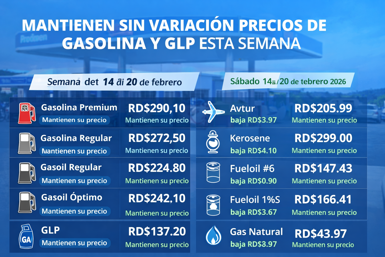 Santo Domingo.— El Gobierno dominicano anunció que los principales combustibles de uso masivo mantendrán sus precios sin variación durante la semana del 14 al 20 de febrero de 2026, como parte de las medidas adoptadas para preservar la estabilidad del mercado interno.