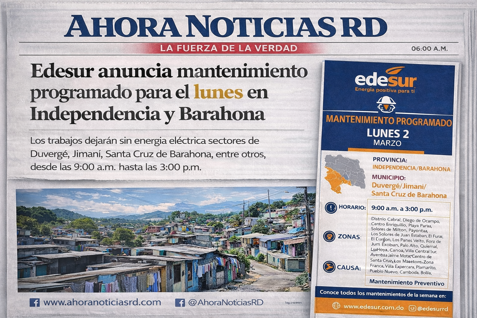 Barahona. La Empresa Distribuidora de Electricidad del Sur (Edesur Dominicana) informó que este lunes 2 de marzo llevará a cabo trabajos de mantenimiento preventivo en distintas zonas de las provincias Barahona e Independencia, lo que implicará interrupciones temporales en el servicio eléctrico.