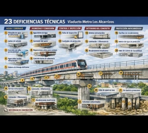 Cabe destacar que investigaciones periodísticas, como el reportaje de “El Informe”, también han señalado irregularidades en la obra, incluyendo varillas expuestas, signos de corrosión, piezas mal alineadas y acabados deficientes, lo que ha generado cuestionamientos sobre la calidad de la construcción y los procesos de supervisión.