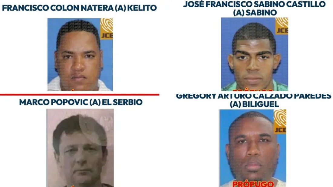 Los fugitivos fueron identificados como el ciudadano serbio Marco Popovic, y los dominicanos Gregory Arturo Calzado Paredes (Biliguel), José Francisco Sabino Castillo (Sabino) y Francisco Colón Natera (Kelito), todos requeridos mediante órdenes judiciales para responder por las imputaciones en su contra.