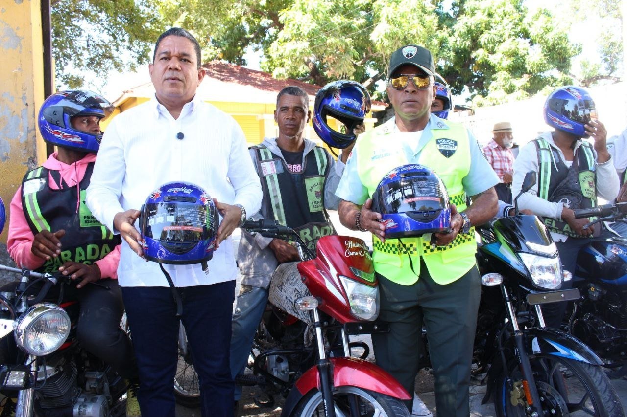 Barahona, 30 de marzo 2026– El senador por la provincia, doctor Moisés Ayala Pérez, encabezó junto al director regional Sur de la DIGESETT, coronel Miguel Antonio Guzmán Pérez, una jornada de entrega de cascos protectores dirigida a motoconchistas de distintas paradas de esta ciudad, como parte de las acciones orientadas a preservar vidas y fortalecer la seguridad vial.