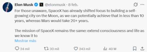 Elon Musk redefine la agenda espacial: Marte queda en pausa y la Luna toma protagonismo – (Captura de pantalla X de Elon Musk)