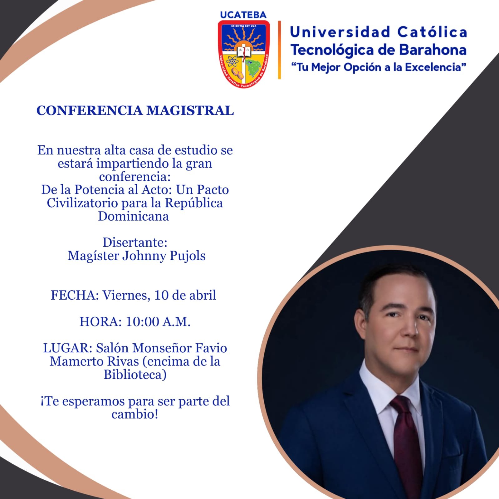 Villa Central, Barahona.– La Universidad Católica Tecnológica de Barahona (UCATEBA) anunció la realización de la conferencia magistral titulada “De la Potencia al Acto: Un Pacto Civilizatorio para la República Dominicana”, una actividad académica orientada a fomentar el análisis y la reflexión sobre los desafíos sociales y el desarrollo del país.